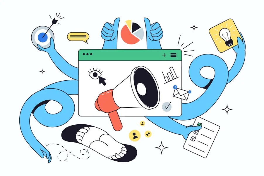 Download: Digital marketing flat concept for web design. Online announcement and megaphone communication, advertising campaign for audience engagement, influence and business presentation. Vector illustration.