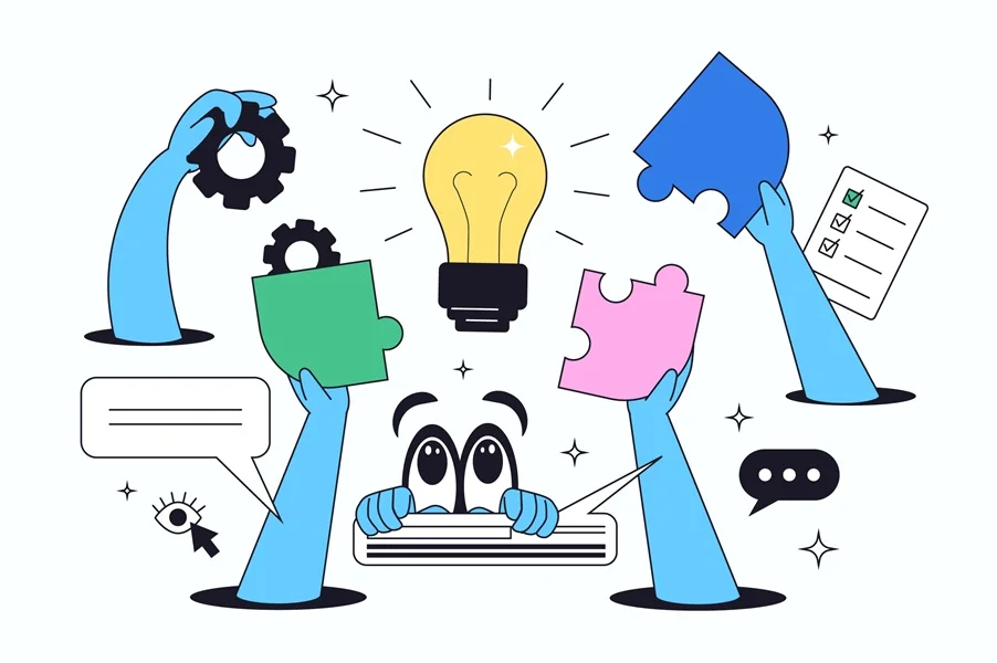 Download: Teamwork flat concept for web design. Solve problem and finding best solutions in team, brainstorming together for innovation and progress, employees cooperation at project. Vector illustration.