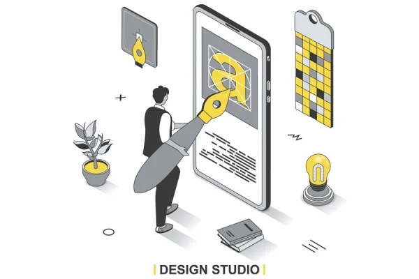 Download: Design studio concept in 3d isometric outline design. Designer with huge brush draws graphic elements for interface of mobile application, line web template. Vector illustration with people scene
