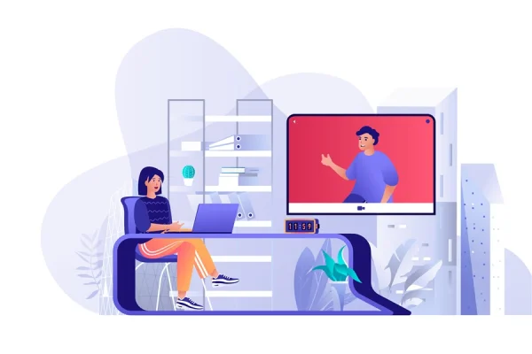 Download: Video conference concept for modern web design. People communication online, woman and man talking in talking chat, colleagues working in zoom. Flat vector illustration isolated on white background.