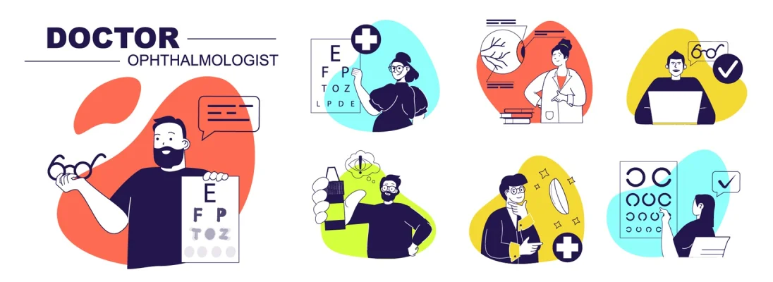Download: Doctor ophthalmologist concept set for web design. Collection with people visiting eye clinic for eyesight tests, getting correction appointment, specialist doing vision research. Vector illustration.