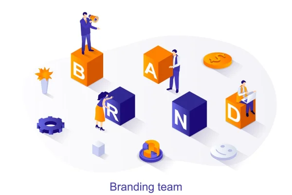 Download: Branding team isometric web concept. People create brand corporate identity, reputation management. Company development success strategy scene. Vector illustration for website template in 3d design