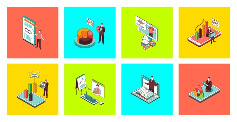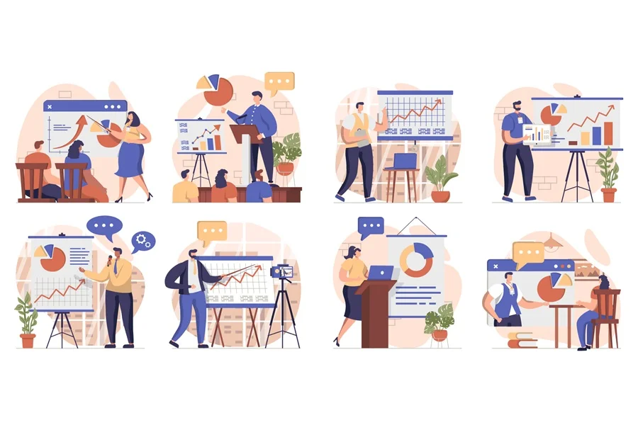 Download: Coach speaking collection of scenes isolated. People learn at business training, career development, set in flat design. Vector illustration for blogging, website, mobile app, promotional materials.