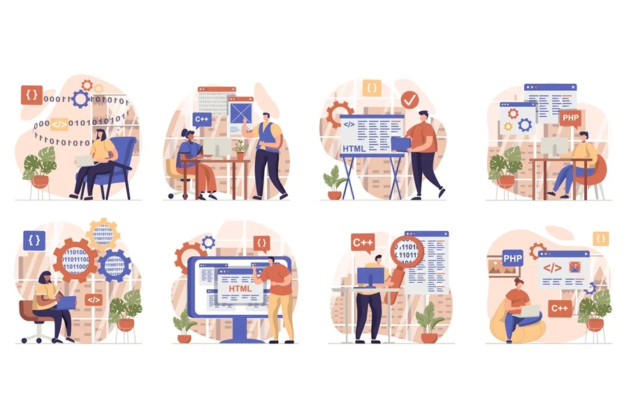 Download: Programmer working collection of scenes isolated. People create programs, configure and test software, set in flat design. Vector illustration for blogging, website, mobile app, promotional materials.
