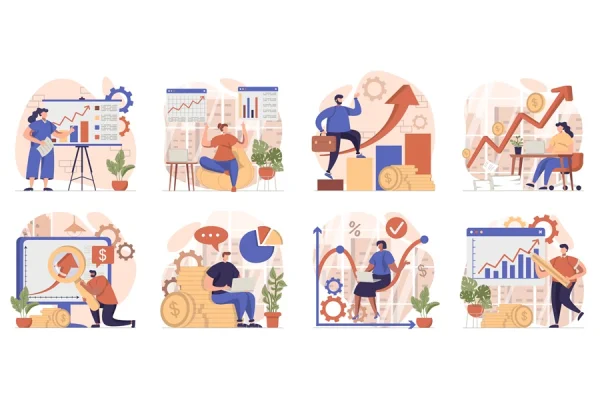 Download: Sales performance collection of scenes isolated. People analyze financial data and income growth, set in flat design. Vector illustration for blogging, website, mobile app, promotional materials.