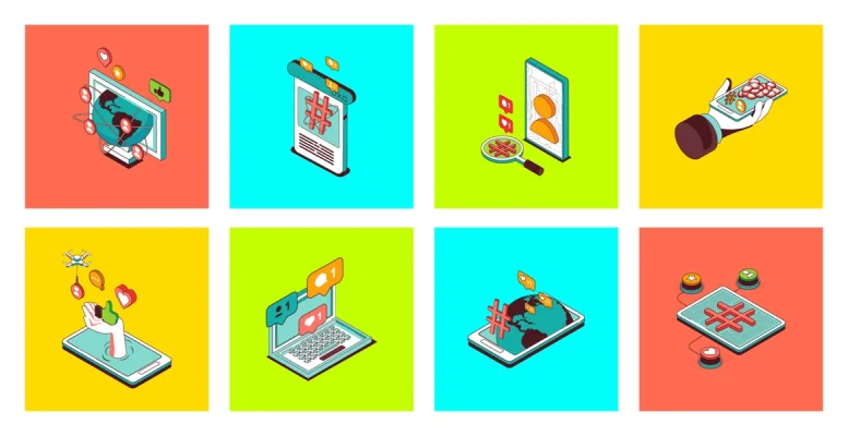 Download: Social network collection of scenes isolated. People browsing posts, like, chatting online at apps, set in flat design. Vector illustration for blogging, website, mobile app, promotional materials.