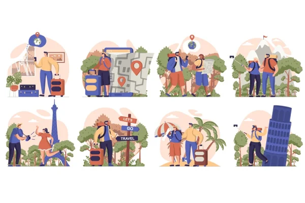Download: Travelling people collection of scenes isolated. Travelers go on vacation, hiking, resort, sightseeing set in flat design. Vector illustration for blogging, website, mobile app, promotional materials.