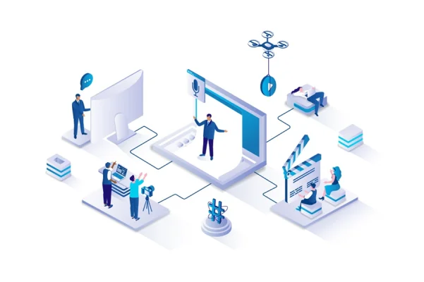 Download: Blogging 3d isometric concept with isometry people design for web. Team creating blog content in studio, posting videos, making live translation, collecting likes and influence. Vector illustration.