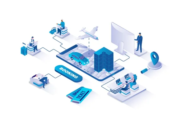 Download: Booking 3d isometric concept with isometry people design for web. Travelers searching and booking tickets to airplane, making online reservation, planning their travel logistic. Vector illustration.