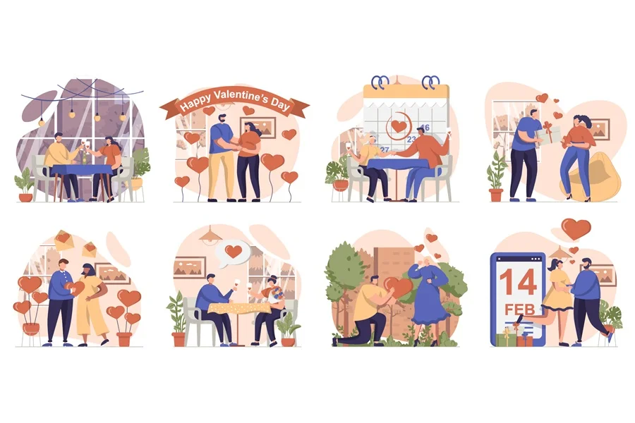 Download: Valentines day collection of scenes isolated. People go on romantic dates, love and relationships, set in flat design. Vector illustration for blogging, website, mobile app, promotional materials.