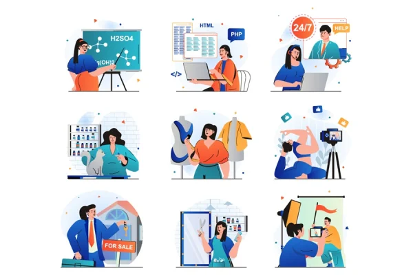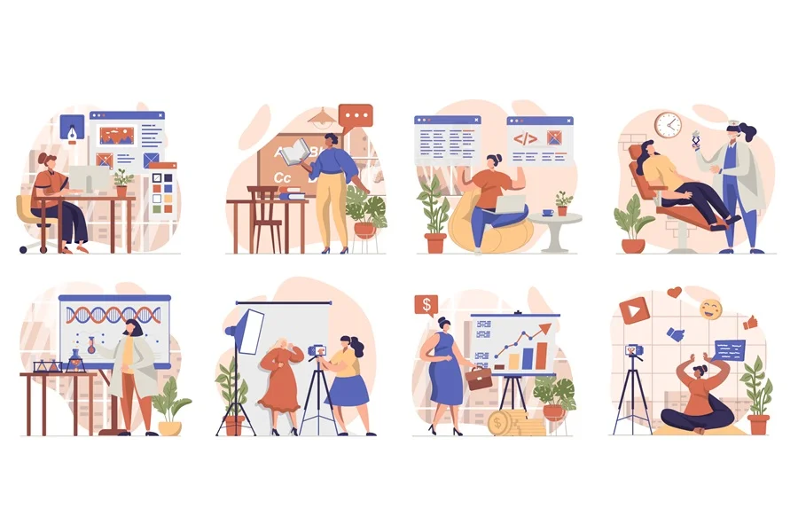Download: Women working collection of scenes isolated. People work at different professions or occupations, set in flat design. Vector illustration for blogging, website, mobile app, promotional materials.
