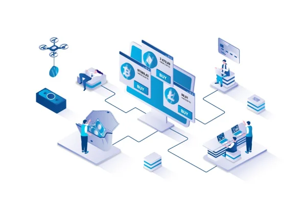 Download: Cryptocurrency marketplace 3d isometric concept with isometry people design for web. Users making virtual financial transactions, buying or selling bitcoins, investing money. Vector illustration.