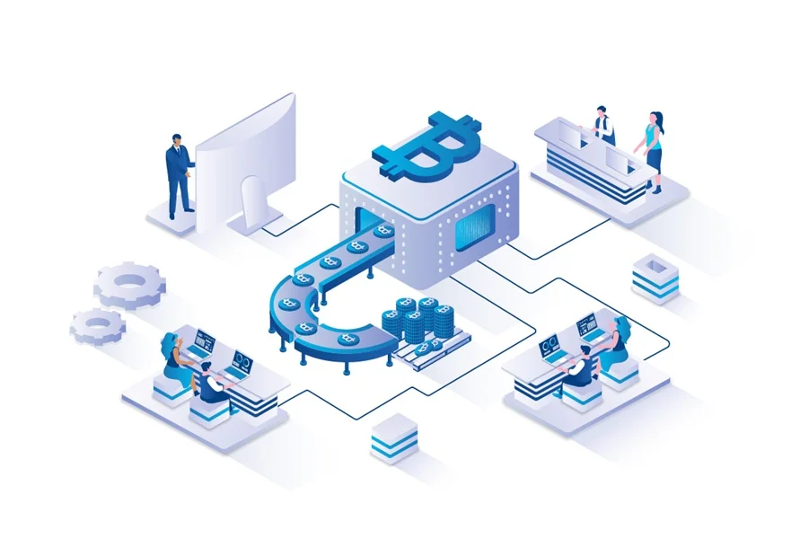 Download: Cryptocurrency technology 3d isometric concept with isometry people design for web. People creating mining farms, investing money in crypto business and blockchain technology. Vector illustration.