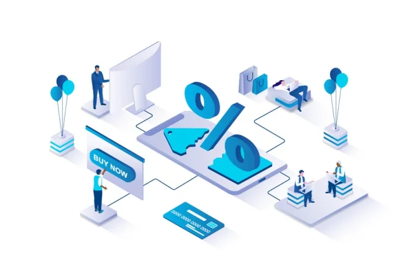 Download: Discount of goods 3d isometric concept with isometry people design for web. Customers looking for best offers prices, doing online shopping in apps with promo tags ordering. Vector illustration.