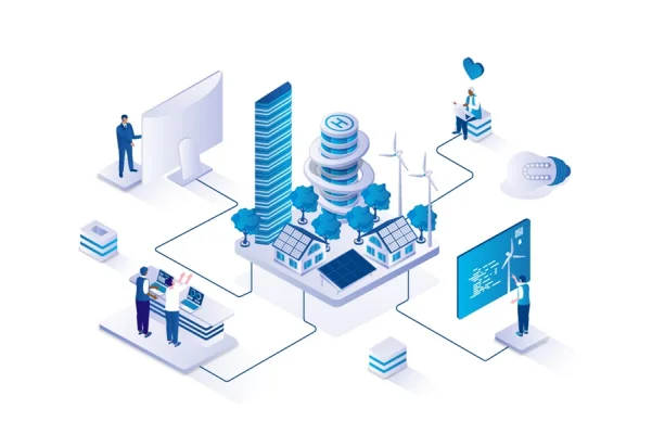 Download: Green city 3d isometric concept with isometry people design for web. People using renewable energy from wind turbines and solar panels, living in environmental sustainable town. Vector illustration.