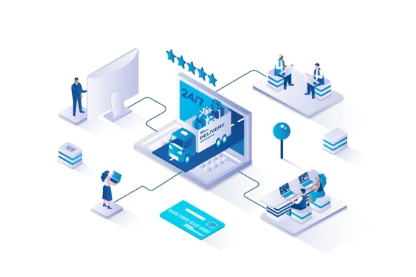 Download: Online delivery 3d isometric concept with isometry people design for web. Clients using fast shipping and courier services with parcels tracking, post transportation with trucks. Vector illustration.