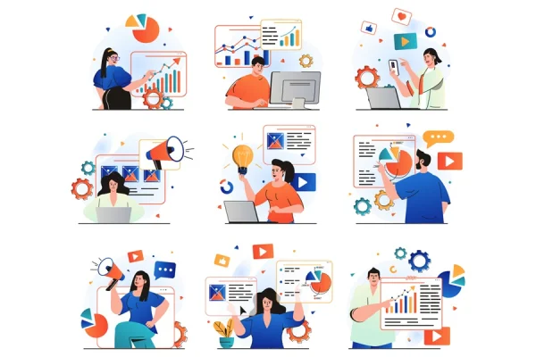 Download: Marketing isolated set. Successful promotion strategy, customer attracting. People collection of scenes in flat design. Vector illustration for blogging, website, mobile app, promotional materials.
