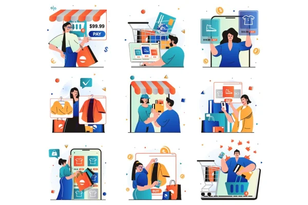 Download: Online shopping isolated set. Customers choose and pay for purchases on site. People collection of scenes in flat design. Vector illustration for blogging, website, mobile app, promotional materials.
