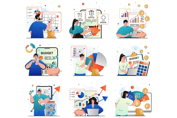 Download: Planning financial budget isolated set. Accounting analysis and savings. People collection of scenes in flat design. Vector illustration for blogging, website, mobile app, promotional materials.