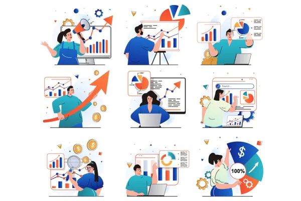 Download: Sales performance isolated set. Financial profit growth, increase in earnings. People collection of scenes in flat design. Vector illustration for blogging, website, mobile app, promotional materials.