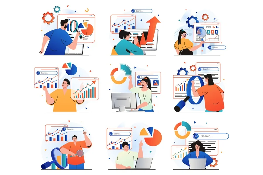Seo analysis isolated set illustrations