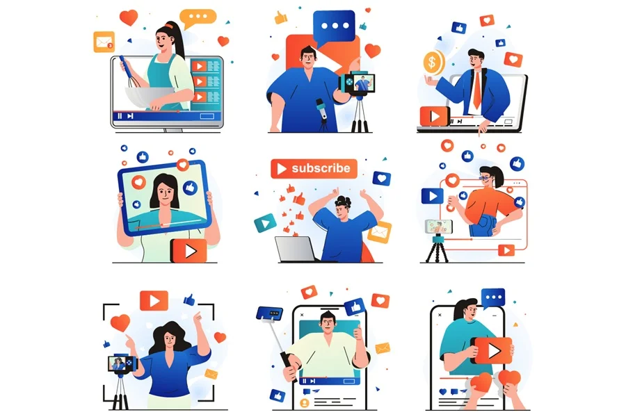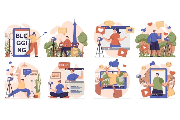 Download: Video blogging isolated set. Bloggers record videos, create blog content. People collection of scenes in flat design. Vector illustration for blogging, website, mobile app, promotional materials.