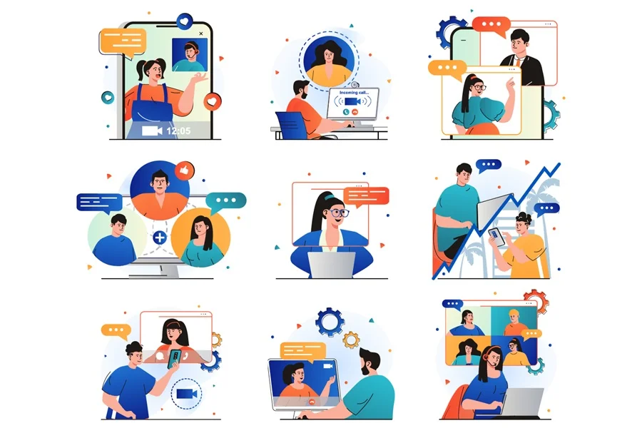 Download: Video chatting isolated set. Online communication using video calling app. People collection of scenes in flat design. Vector illustration for blogging, website, mobile app, promotional materials.