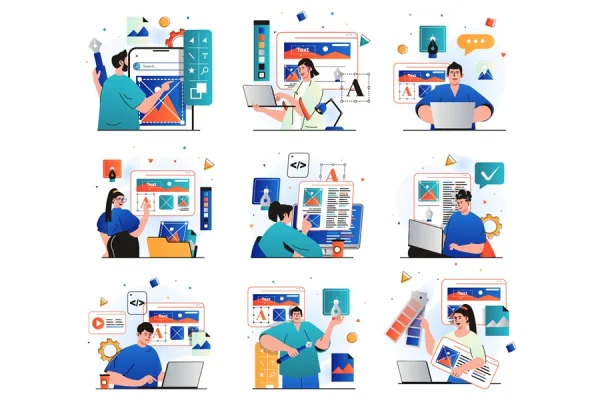 Download: Web design isolated set. Designers create website layout, place elements. People collection of scenes in flat design. Vector illustration for blogging, website, mobile app, promotional materials.