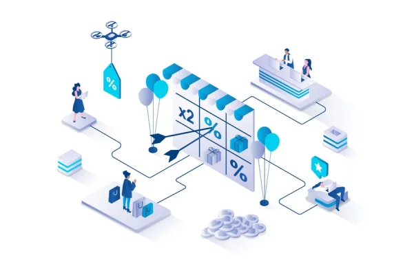 Download: Shop loyalty program 3d isometric concept with isometry people design for web. Buyers making purchases and receiving bonuses and gifts from stores, smart shopping with discounts. Vector illustration.