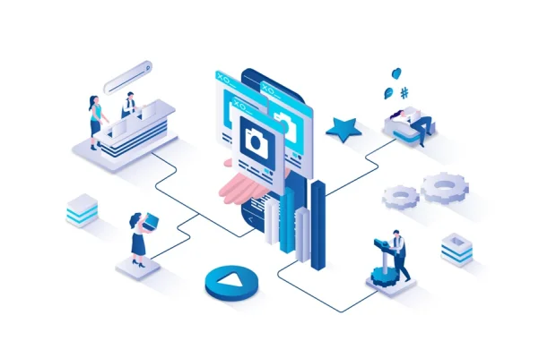 Download: SMM 3d isometric concept with isometry people design for web. Team analyzing data and developing online promotion strategy, making new posts with sharing promo information. Vector illustration.