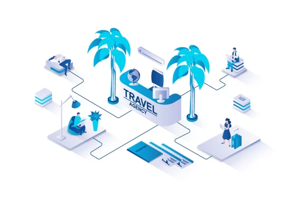 Download: Travel agency 3d isometric concept with isometry people design for web. Tourists with luggage choosing vacation tour with assistant in office, buy plane tickets and booking hotel. Vector illustration.