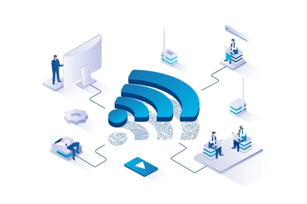 Download: Wireless technology 3d isometric concept with isometry people design for web. Users accessing to wifi hotspot to get internet connection from laptop, computer or smart phone. Vector illustration.
