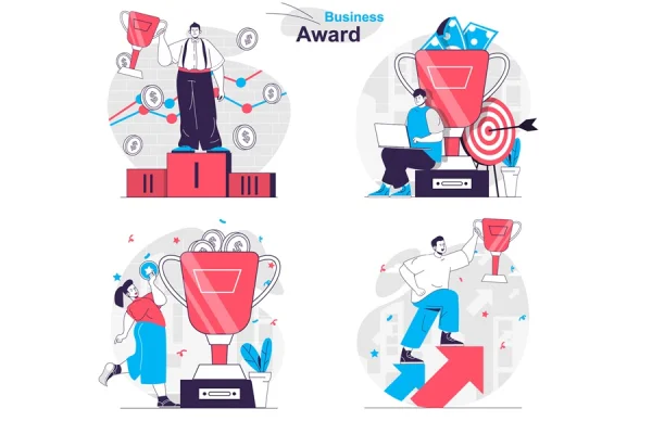 Download: Business award concept set. Successful businessman or businesswoman achieves goals. People isolated scenes in flat design. Vector illustration for blogging, website, mobile app, promotional materials.