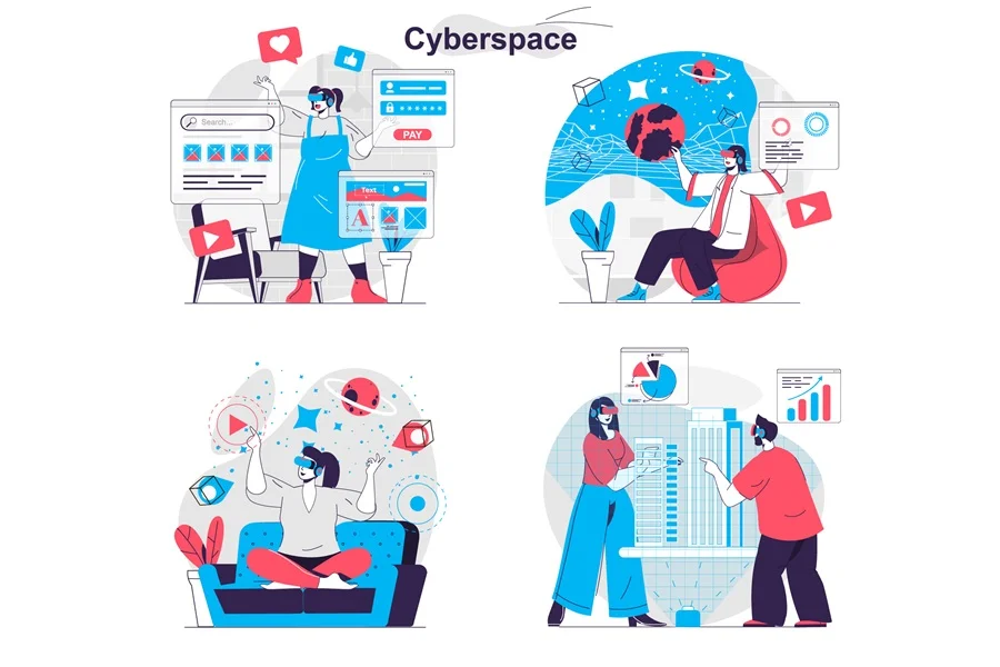 Download: Cyberspace concept set. Virtual reality headset for education and data analysis. People isolated scenes in flat design. Vector illustration for blogging, website, mobile app, promotional materials.
