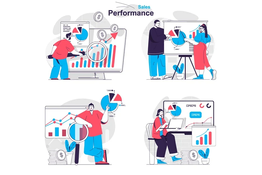 Download: Sales performance concept set. Marketers analyze data on income profit business. People isolated scenes in flat design. Vector illustration for blogging, website, mobile app, promotional materials.