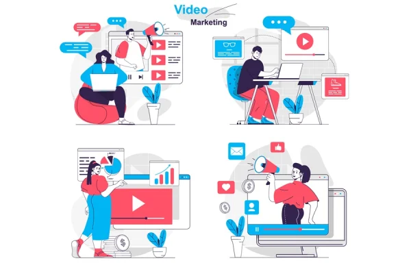 Download: Video marketing concept set. Creation and promotion advertising information video. People isolated scenes in flat design. Vector illustration for blogging, website, mobile app, promotional materials.