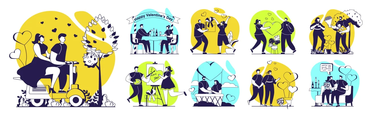 Download: Valentine's Day concept set for web design. Collection with people celebrating romantic holiday, couples go on date, riding motorbike, girlfriend and boyfriend relationships. Vector illustration.