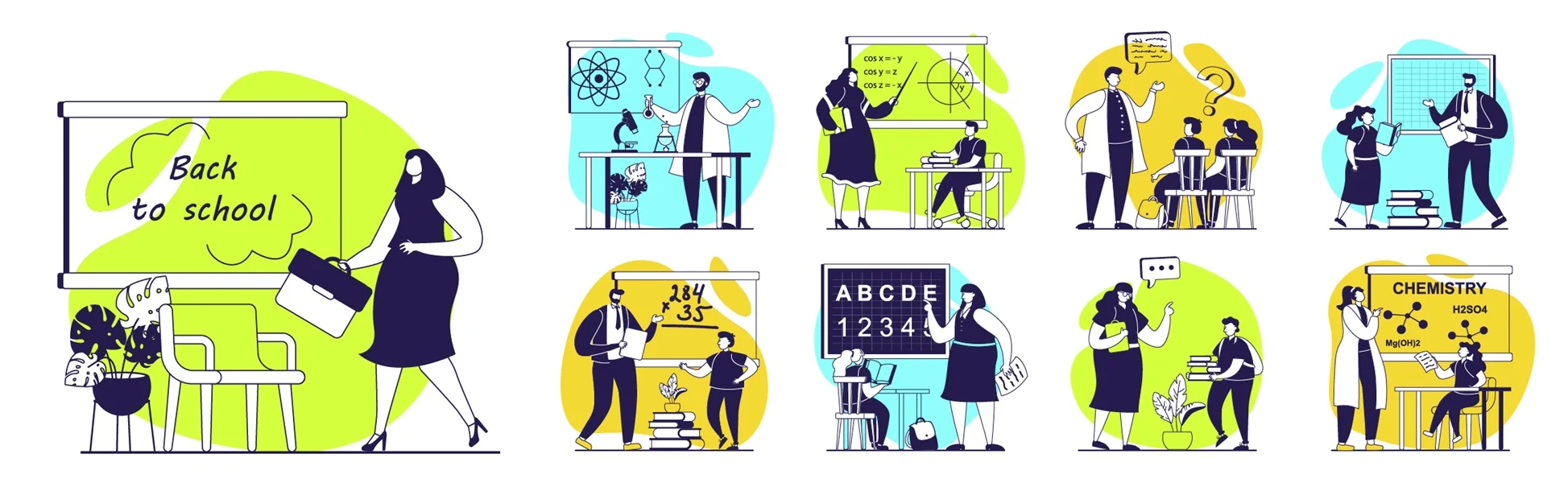 Download: School teachers concept set for web design. Collection with people teaching pupils at lessons, pointing blackboard, explaining math or chemistry and other sciences in classroom. Vector illustration.