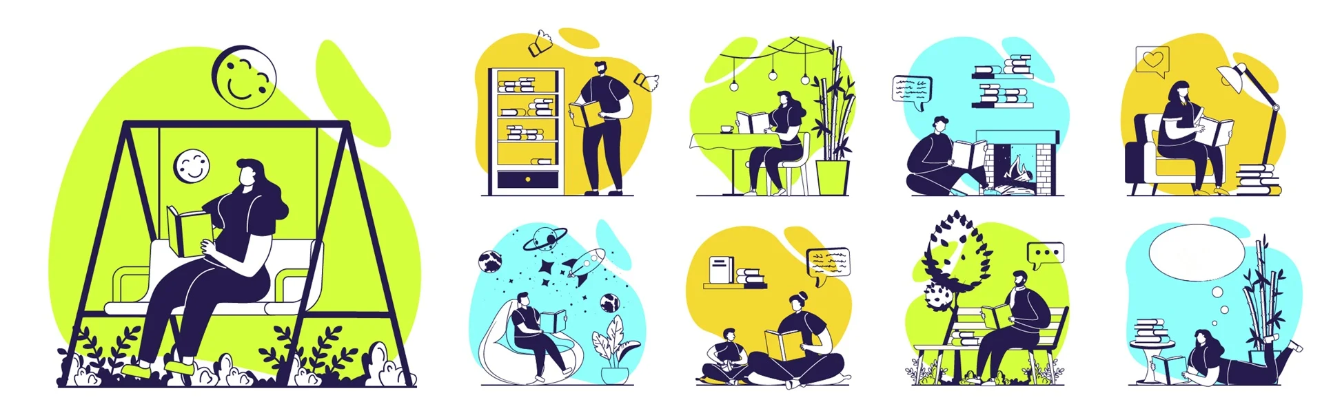 Download: People reading book concept set for web design. Collection of scenes with reading lovers pastime with different literature, bookworms in bookshop, students study from textbooks. Vector illustration.