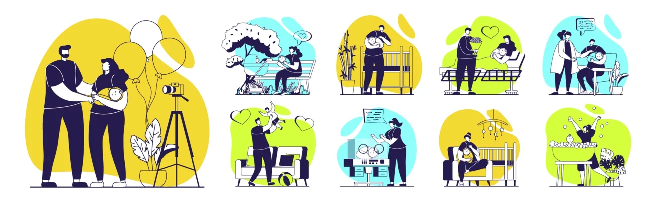 Download: Healthy families concept set for web design. Collection with people with children doing yoga, playing games, cycling in park, running, eating healthy diet and active lifestyle. Vector illustration.