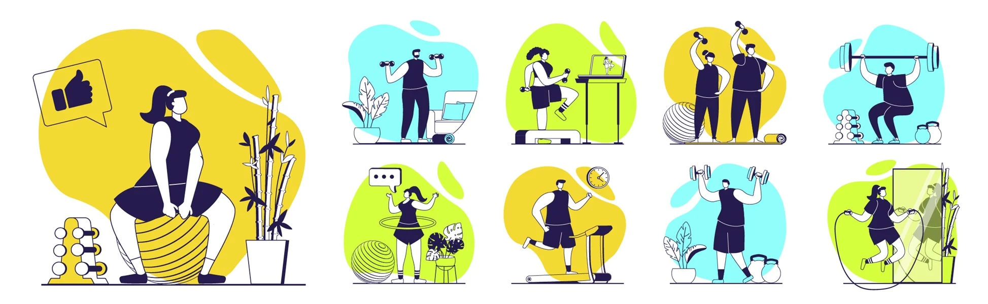 Download: Fitness at gym concept set for web design. Collection with people doing bodybuilding, gymnastic, aerobics or weightlifting, exercising on treadmills, training at home workouts. Vector illustration.