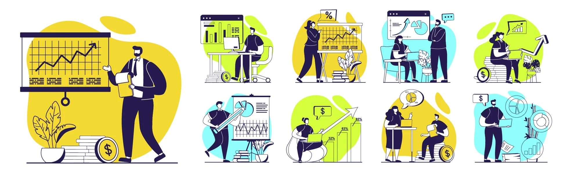 Download: Financial analysis concept set for web design. Collection with people working with data, making financial report with statistics, planning strategy with growth profit progress. Vector illustration.