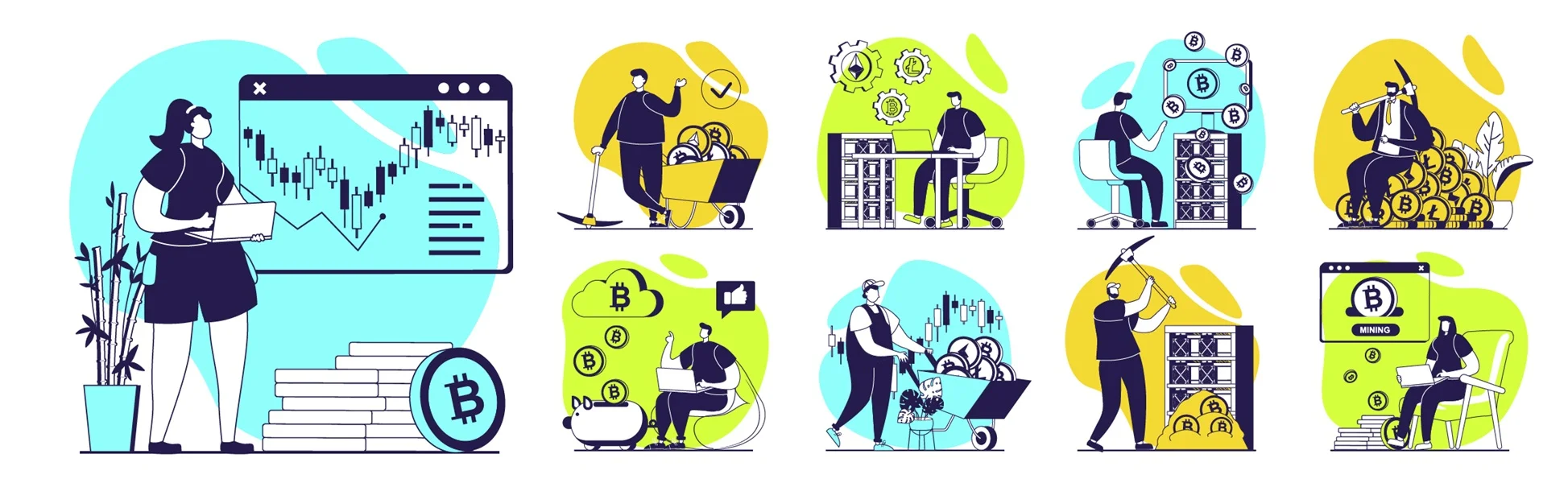 Download: Cryptocurrency mining concept set for web design. Collection with people sell and buy bitcoins and digital coins, analyzing financial data at bar charts, increase income profit. Vector illustration.