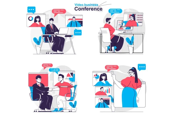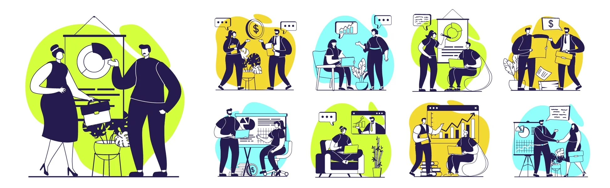 Download: Business meeting concept set for web design. Collection with people discussing financial report with graph, making contracts, brainstorming in team, managing teamwork at office. Vector illustration.