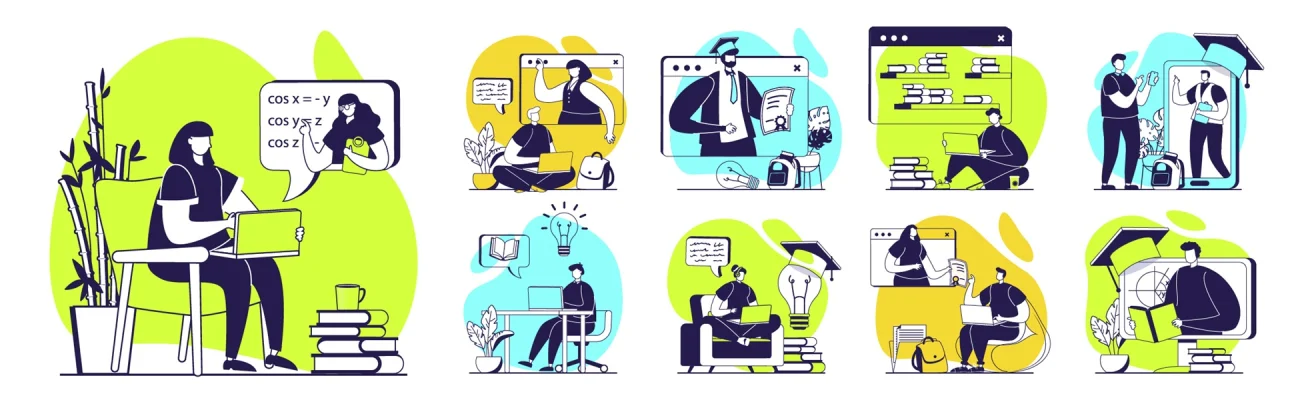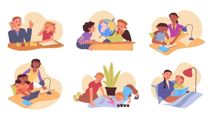 Download: Children learning concept set with cartoon people for web design. Collection with boys and girls pupils study addition with fruits, geography, drawing, do homework with parent. Vector illustration.