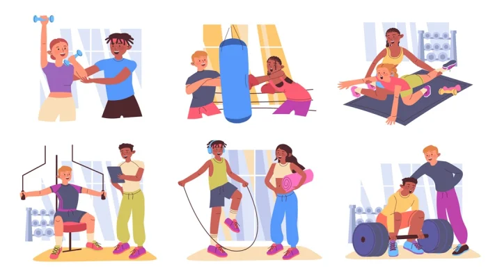 Download: Fitness at gym concept set with cartoon people for web design. Collection with athletes training with dumbbells, boxing, do pilates, yoga, exercising with trainer, weightlifting. Vector illustration.