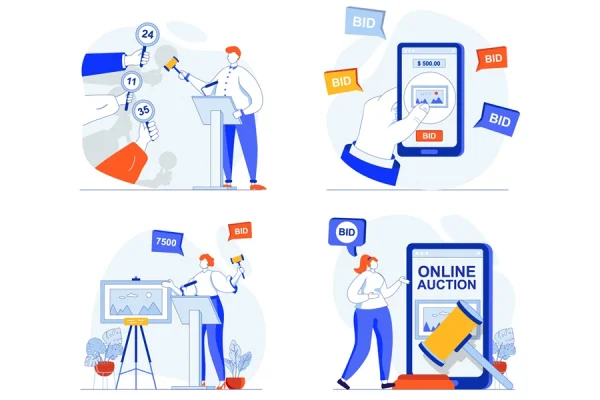Download: Auction concept set. Selling painting, buyers place bids, buying in online auction. People isolated scenes in flat design. Vector illustration for blogging, website, mobile app, promotional materials.