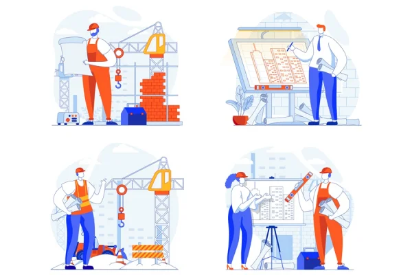 Download: Construction engineer concept set. Architect with plan, contractor works on site. People isolated scenes in flat design. Vector illustration for blogging, website, mobile app, promotional materials.