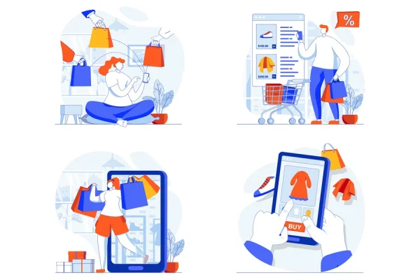 Download: Mobile commerce concept set. Buyers make purchases in app, smart online shopping. People isolated scenes in flat design. Vector illustration for blogging, website, mobile app, promotional materials.