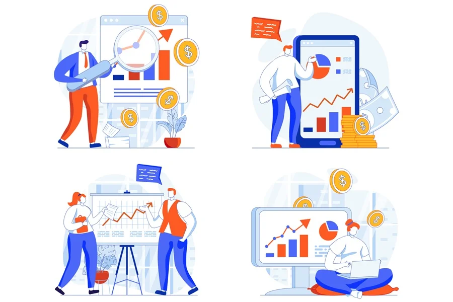Download: Sales performance concept set. Statistics analysis, data analytics, income growth. People isolated scenes in flat design. Vector illustration for blogging, website, mobile app, promotional materials.